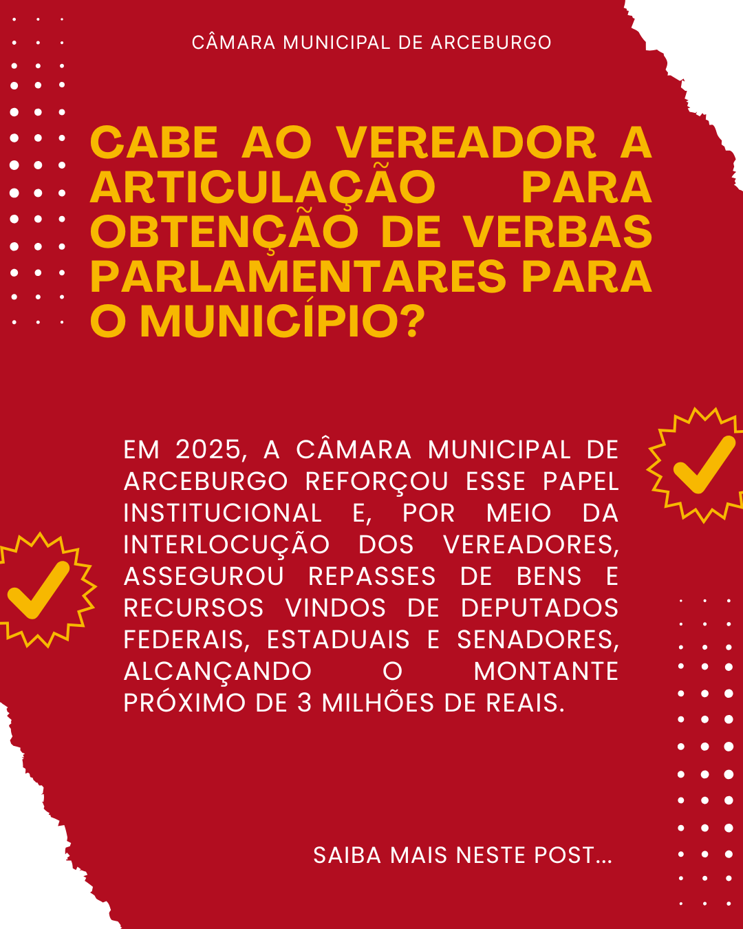 Em 2025, a Câmara Municipal de Arceburgo reforçou esse papel institucional e, por meio da interlocução dos vereadores, assegurou repasses de bens e recursos vindos de deputados federais, estaduais e senadores, alcançando o montante próximo de 3 milhões de reais.