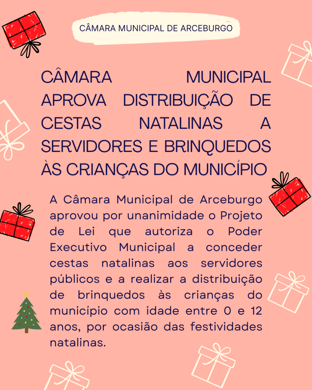 A Câmara Municipal de Arceburgo aprovou por unanimidade o Projeto de Lei que autoriza o Poder Executivo Municipal a conceder cestas natalinas aos servidores públicos e a realizar a distribuição de brinquedos às crianças do município com idade entre 0 e 12 anos, por ocasião das festividades natalinas.