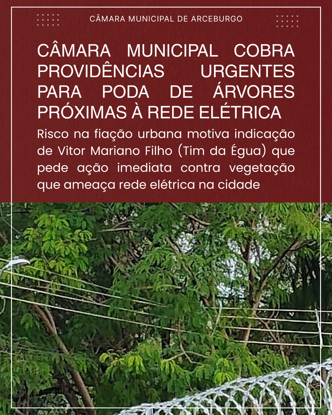 Segundo o parlamentar, a demanda tem sido recorrente por parte de moradores, que relatam preocupação com galhos avançando sobre a rede energizada. O pedido, conforme destacado na indicação, não se restringe à manutenção estética da vegetação urbana, mas tem como principal objetivo a prevenção de acidentes, curtos-circuitos, quedas de energia e possíveis danos a imóveis e equipamentos eletroeletrônicos.