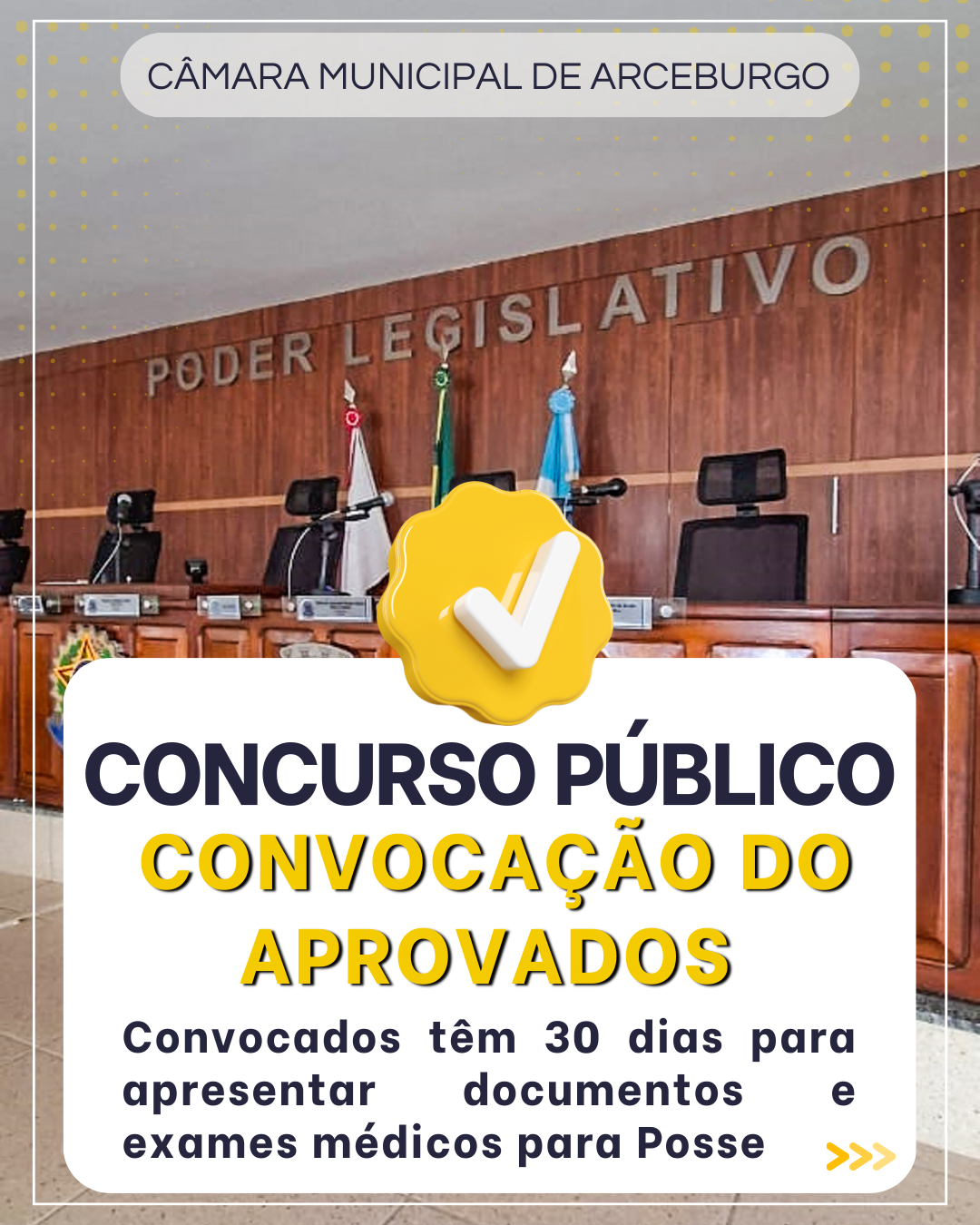 A Câmara Municipal de Arceburgo publicou o 1º Edital de Convocação e Posse do Concurso Público nº 01/2025, convocando os candidatos aprovados no certame realizado em 8 de fevereiro de 2026 para assumirem seus respectivos cargos no Legislativo.