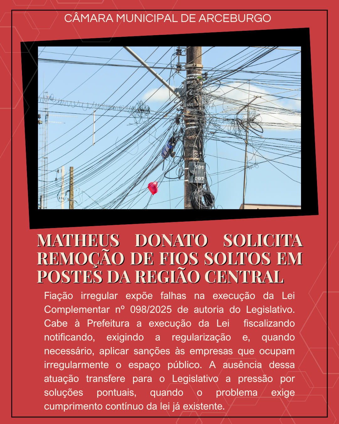 A situação crítica da fiação aérea em Arceburgo voltou ao centro do debate na Câmara Municipal com a apresentação de uma Indicação do vereador Matheus Donato que cobra providências imediatas da Prefeitura para a remoção de fios soltos e inutilizados em postes da região central da cidade. O caso evidencia que a medida legislativa seria desnecessária caso houvesse a efetiva execução da Lei Complementar nº 098/2025, já em vigor no município.