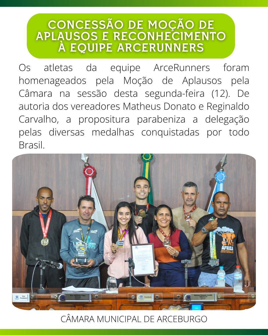 Os atletas da equipe ArceRunners foram homenageados pela Moção de Aplausos aprovada pela Câmara na sessão desta segunda-feira (12). De autoria dos vereadores Matheus Donato e Reginaldo Carvalho, a propositura parabeniza a delegação pelas diversas medalhas conquistadas por todo Brasil.