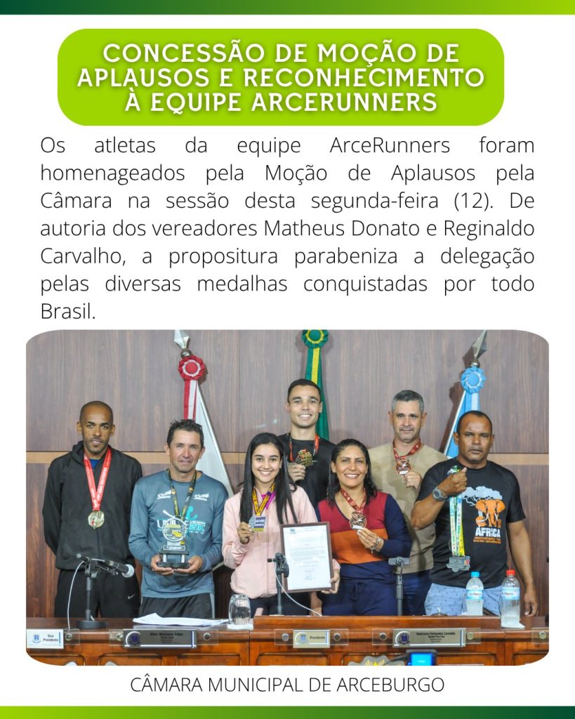 A conquista das medalhas e a consideração pelo município arceburguense é resultado do esforço e dedicação dos atletas, e a Moção tem o propósito de aplaudir esses competentes atletas, destaca trecho do documento, aprovado por unanimidade.