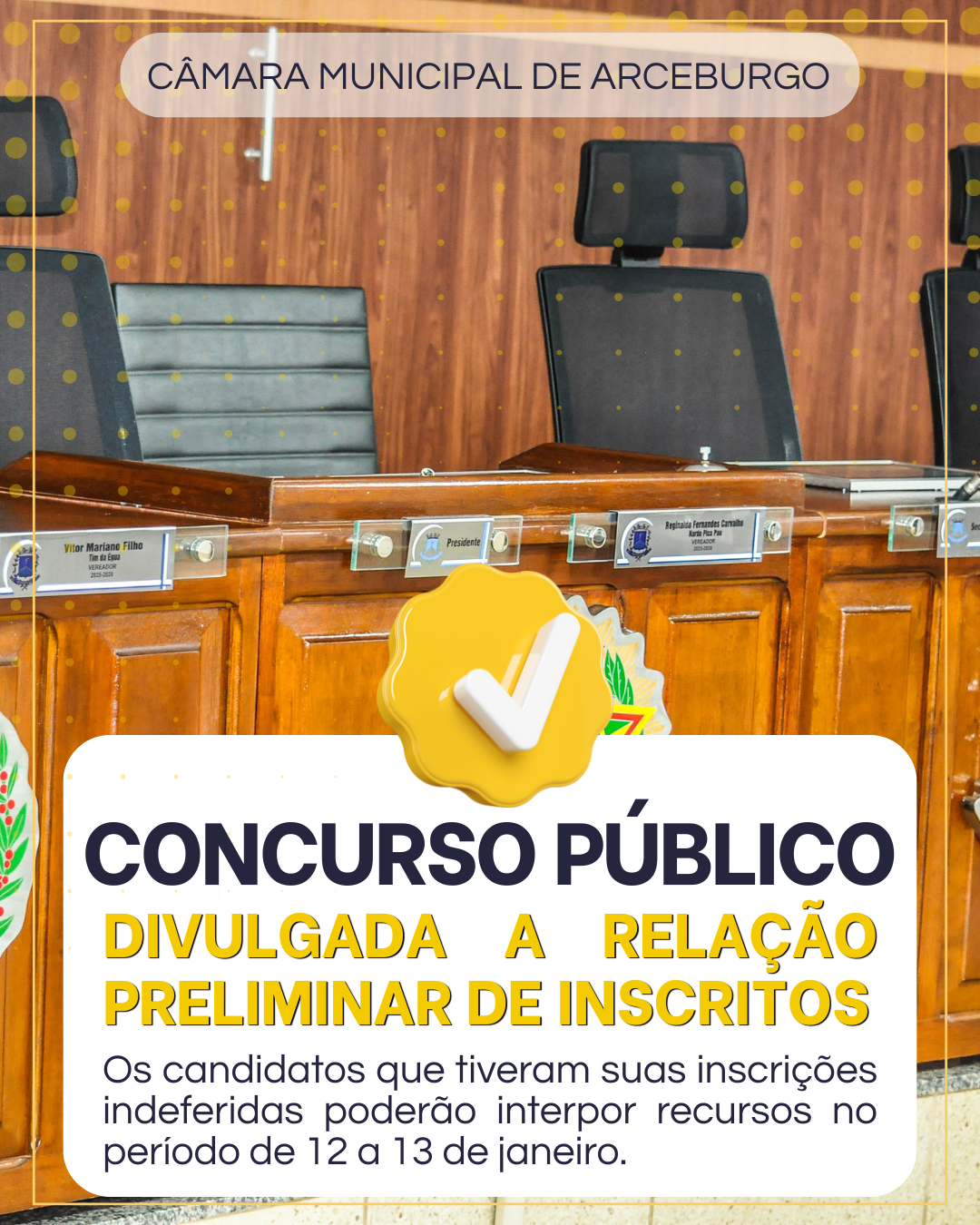 Foi divulgada pelo Instituto IBEPP, a relação preliminar de candidatos inscritos no Concurso Público destinado ao preenchimento de vagas efetivas para o Legislativo Municipal.