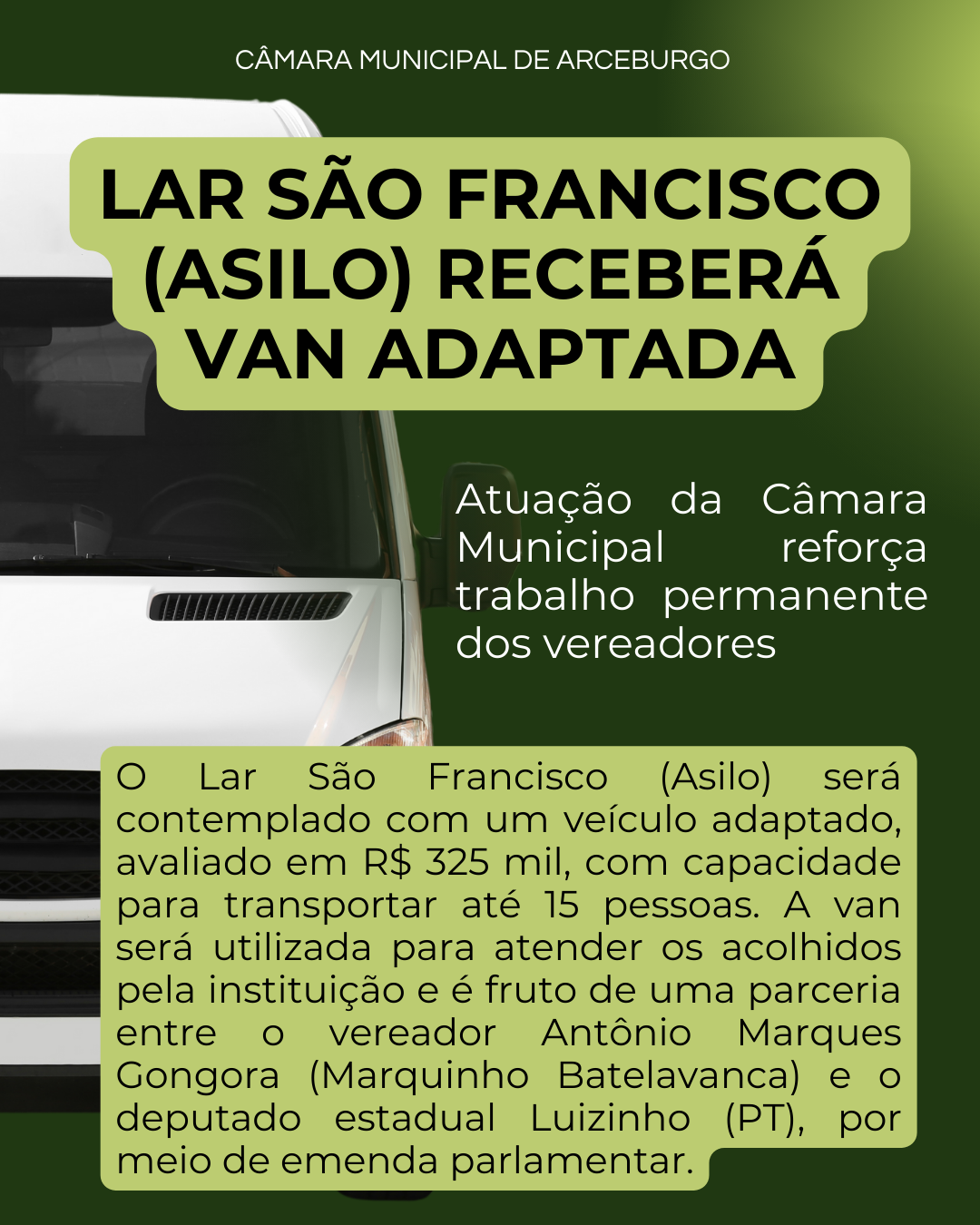 O Lar São Francisco (Asilo) será contemplado com um veículo adaptado, avaliado em R$ 325 mil, com capacidade para transportar até 15 pessoas. A van será utilizada para atender os acolhidos pela instituição e é fruto de uma parceria entre o vereador Marcos Antonio Marques Gongora (Marquinho Batelavanca) e o deputado estadual Luizinho (PT), por meio de emenda parlamentar.