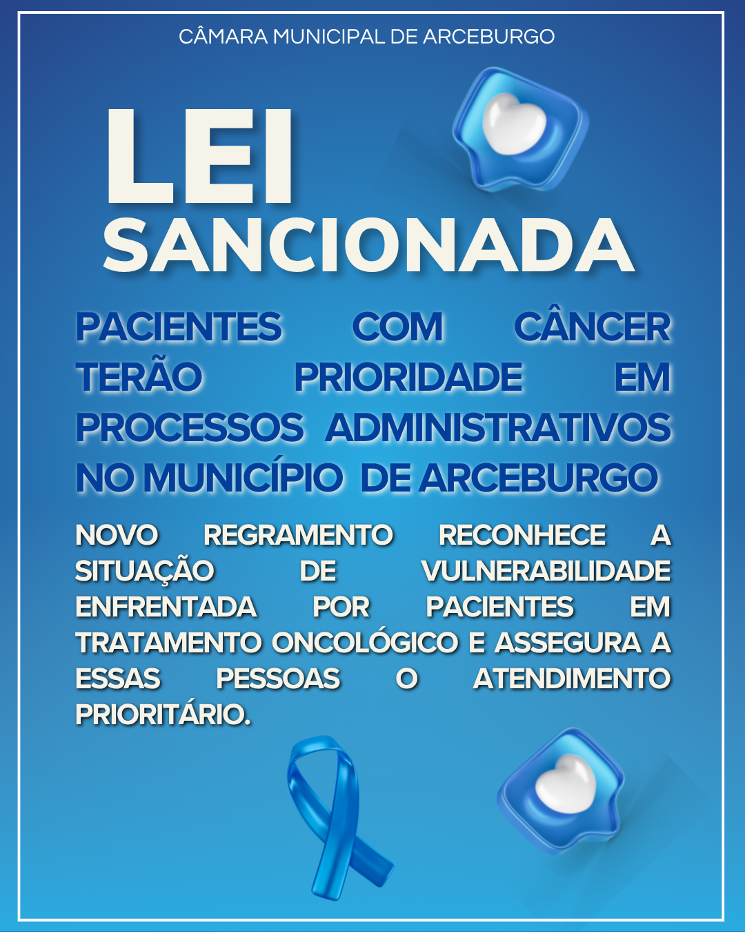 A finalidade é conceder a pessoa diagnosticada com neoplasia maligna (câncer) ou a pessoa com dependente portador de neoplasia maligna o benefício da prioridade na tramitação de qualquer processo administrativo em que figure como parte ou pessoa interessada. A Lei abrange processos em qualquer órgão ou instância da Administração Direta ou Indireta do Município de Arceburgo que garantam ao beneficiário a possibilidade de efetivo acesso e prioridade aos diversos serviços públicos no âmbito municipal.