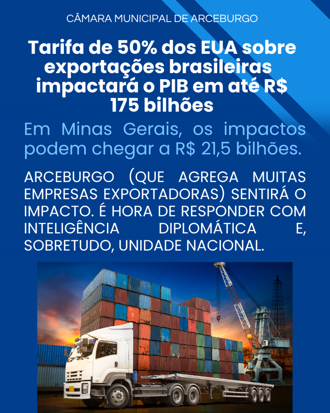 A Câmara Municipal de Arceburgo defende que o governo brasileiro atue de forma firme, mas diplomática, na busca por um acordo que evite o início da vigência da tarifa, proteja os empregos e preserve a competitividade das empresas brasileiras.