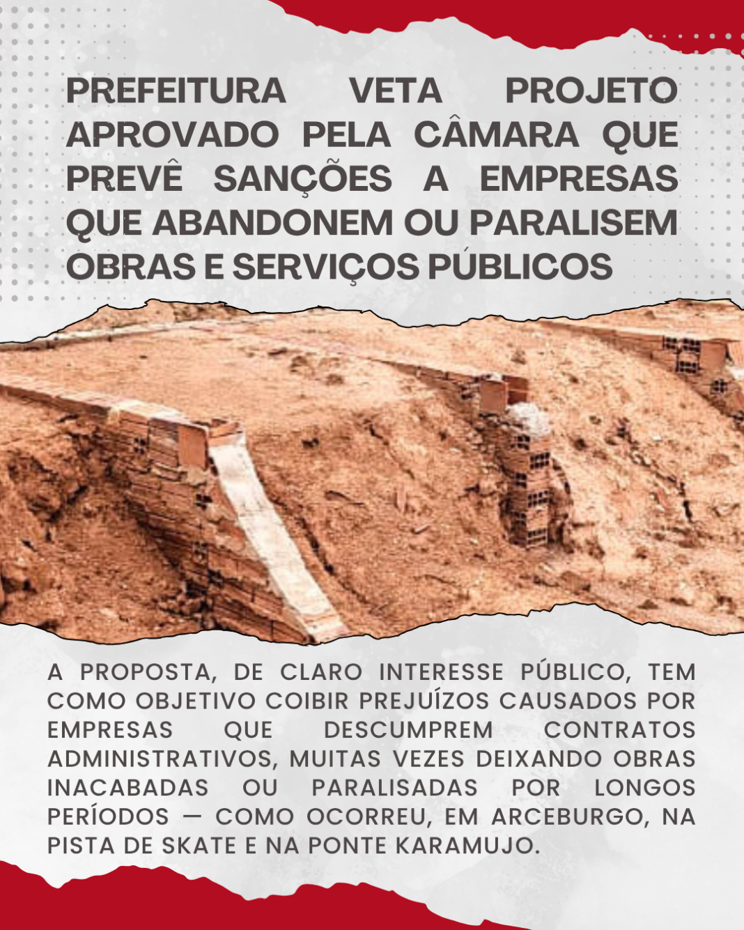 A proposta, de conteúdo eminentemente técnico e de claro interesse público, tem como objetivo coibir prejuízos causados por empresas que descumprem contratos administrativos, muitas vezes deixando obras inacabadas ou paralisadas por longos períodos — como ocorreu, em Arceburgo, na pista de skate e na ponte do Karamujo.