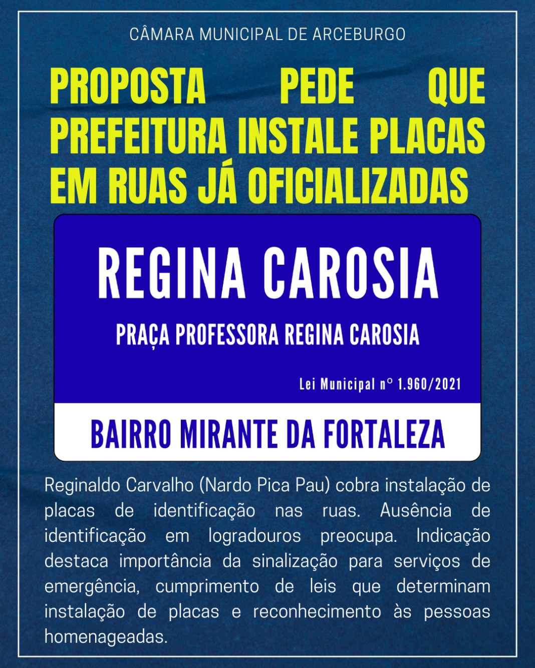 O vereador Reginaldo Fernandes Carvalho apresentou indicação solicitando à Prefeitura a instalação de placas de identificação e sinalização nas ruas e avenidas do município de Arceburgo. A medida busca solucionar a ausência de denominação visível em diversos logradouros da cidade.