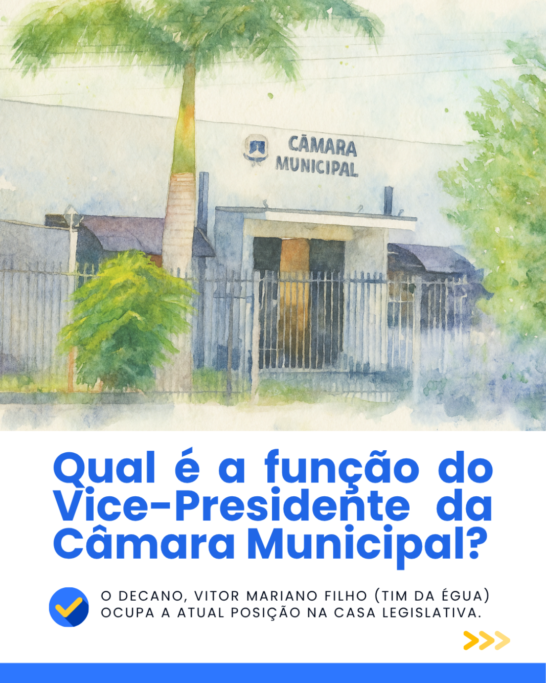 Além disso, atua como elo de diálogo entre a Presidência e os vereadores, promovendo transparência e equilíbrio nas decisões, e pode representar oficialmente a Câmara em eventos e compromissos institucionais, sempre que designado.