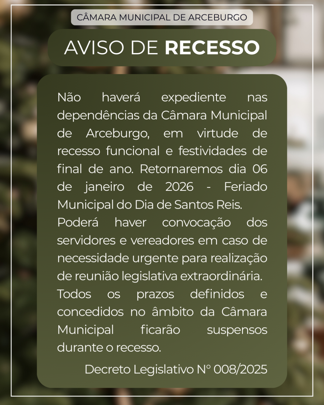 Não haverá expediente nas dependências da Câmara Municipal de Arceburgo, em virtude de recesso funcional e festividades de final de ano. Retornaremos dia 06 de janeiro de 2026 – Feriado Municipal do Dia de Santos Reis.