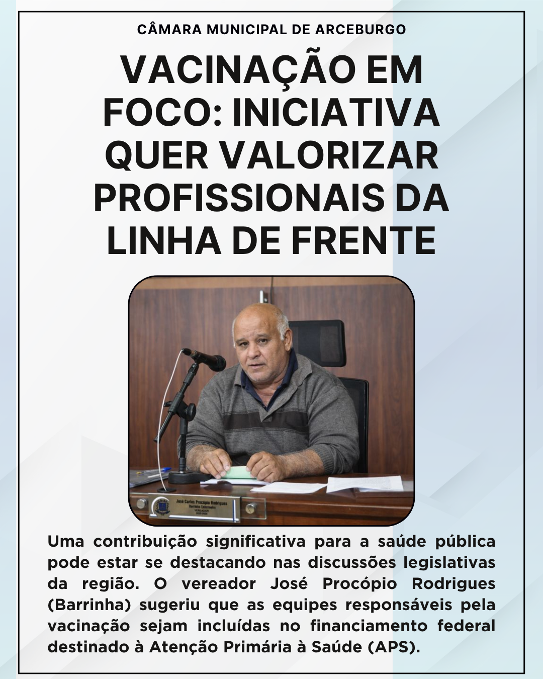 Uma contribuição significativa para a saúde pública pode estar se destacando nas discussões legislativas da região. O vereador José Procópio Rodrigues (Barrinha) sugeriu que as equipes responsáveis pela vacinação sejam incluídas no financiamento federal destinado à Atenção Primária à Saúde (APS). Essa proposta, que ainda precisa ser avaliada e pode resultar na elaboração de um projeto de lei, visa reconhecer o trabalho dos profissionais que atuam diretamente na imunização.