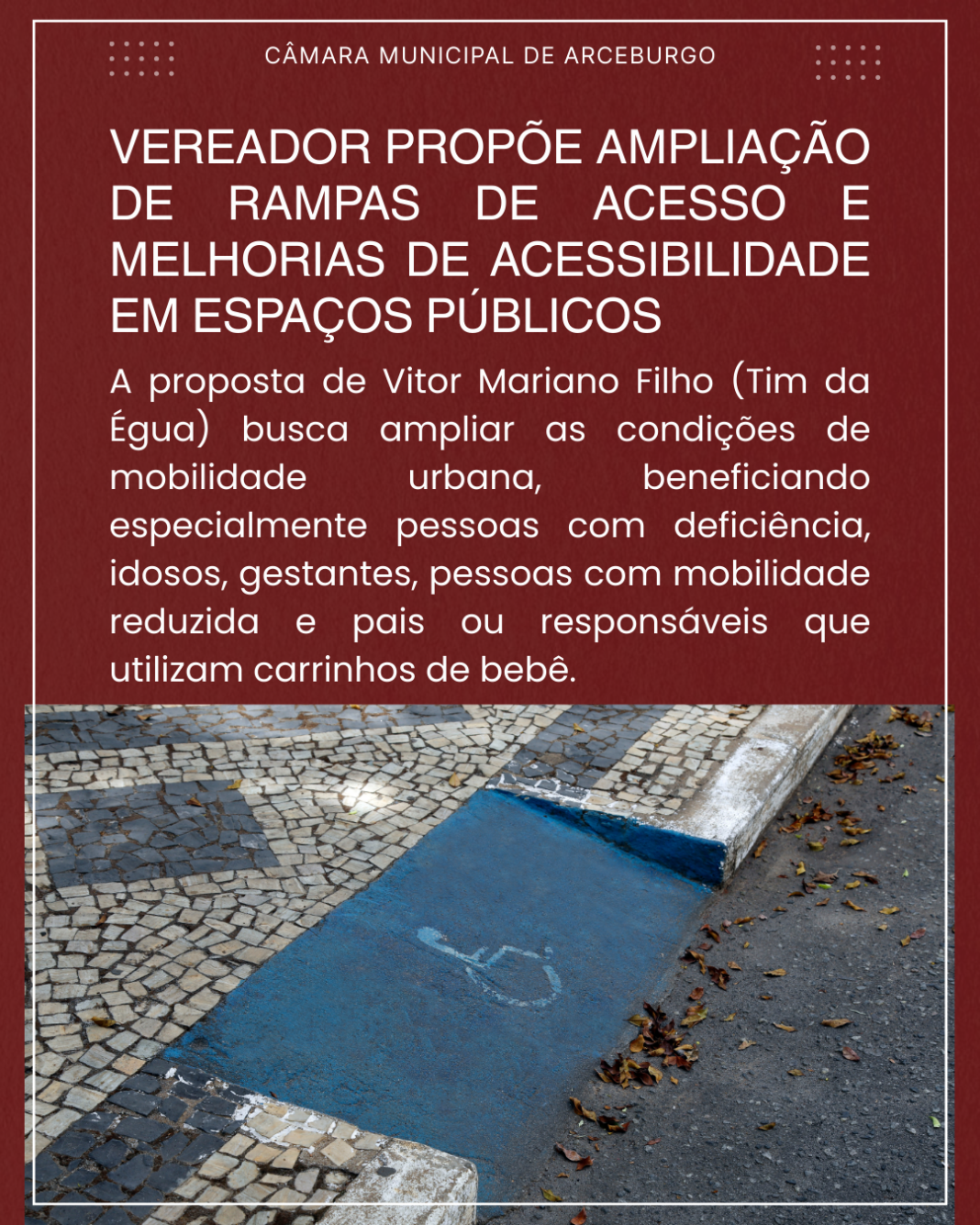 A proposta busca ampliar as condições de mobilidade urbana, beneficiando especialmente pessoas com deficiência, idosos, gestantes, pessoas com mobilidade reduzida e pais ou responsáveis que utilizam carrinhos de bebê. Segundo o vereador, embora o município já conte com algumas rampas de acesso — o que representa um avanço importante — ainda há necessidade de ampliar essas estruturas para garantir deslocamento mais seguro e digno para todos.